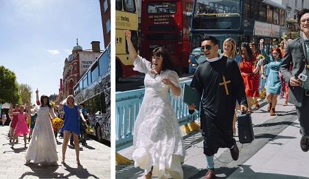 “The wedding took place on May 16, 2015 – a gloriously sunny Saturday. As I changed into my dress, jitters gave way to excitement. My 15 bridesmaids and I danced from Brighton Pier to the Unitarian Church to the sound of Chesney Hawkes’ The One And Only. We all carried bouquets of sunflowers to represent happiness.