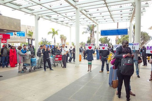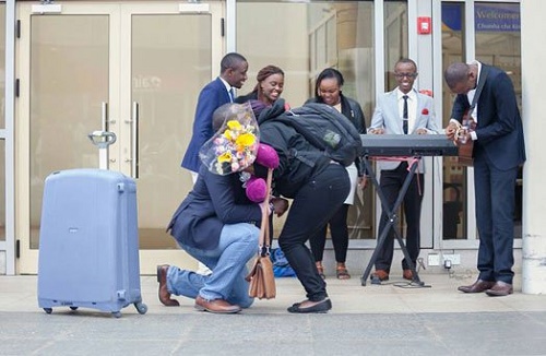 On emerging from the arrival terminal, she found her boyfriend with a bouquet of flowers and before she could make sense of the activities around them, he went down on one knee with a ring in hand.