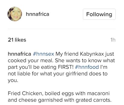 “My friend Kabynkax just cooked your meal. She wants to know what part you’ll be eating FIRST! #hnnfood I’m not liable for what your girlfriend does to you. Fried Chicken, boiled eggs with macaroni and cheese garnished with grated carrots.” she captioned the photo .