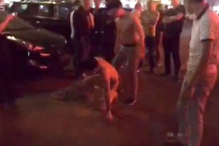 The video shows the man without any clothes on cowering in the road as the husband kicks and punches him. The husband give the man many blows, kicks as the guilty man tries to cover his private parts.
